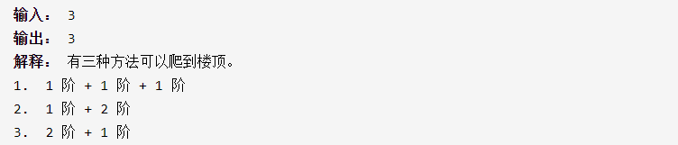 | 题目: 假设你正在爬楼梯。需要 n 阶你才能到达楼顶。 每次你可以爬 1 或 2 个台阶。你有多少种不同的方法可以爬到楼顶呢? 注意: 给定 n 是一个正整数