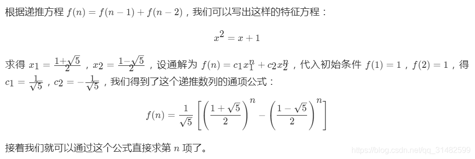 | public static int test3(int n){ double sqrt5 = Math.sqrt(5); double temp = Math.pow((1 + sqrt5) / 2, n + 1) - Math.pow((1 - sqrt5) / 2, n + 1); return (int) (temp / sqrt5); }