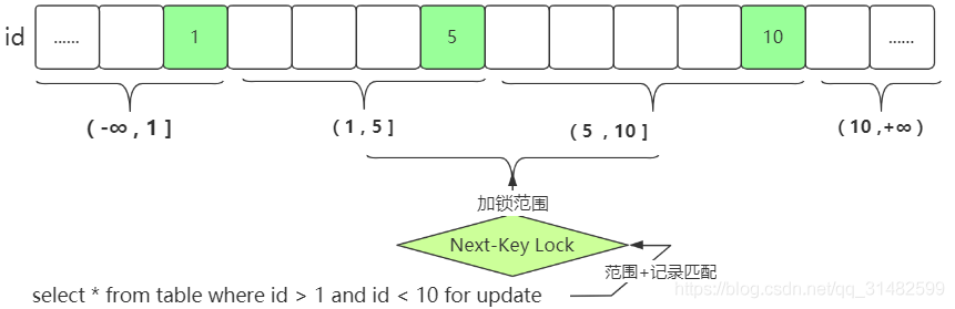 执行上面语句时,锁住的区间为 ( 1, 5 ] 和 (5,10 ],即: