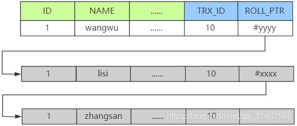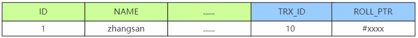 在数据库中每一个表最后面会隐藏两个列,分别是TRX_ID和ROLL_PTR,它们分别是记录事务ID和版本链的引用。如果表中没有主键,也会隐藏一个主键列。