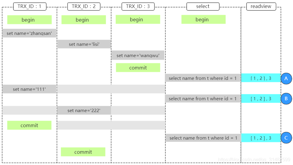 根据版本连对比规则,可以不难的出 A 、 B、 的执行结果 均是 wangwu,又因为在同一个Session 中 一致性事务 readview 是一致的,所以C 的执行结果和上面的一样也是 wangwu。