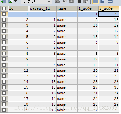 如果业务中已经存在数据,只需要新增两个节点字段 l_node ,r_node 然后根据parent_id 初始化相应的值 - 初始化已存在数据的存储过程:
