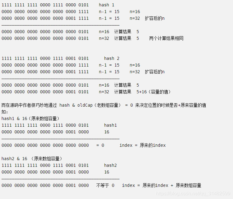 而在HashMap在进行扩容的时候,重新计算hash的方式非常的巧妙。因为每次扩容是翻倍操作,也就是原来的容量*2,并且因为计算index值得公式为 (n-1)&hash, hash值不变,影响的只是n的2倍。所以n 的二进制扩容后就是在原来的基础上向左移动了 1为 也就是说 扩容后的 2n-1 的二进制有效位比原来的多一个1 (如:原来n-1的二进制为1111,扩容后则是11111)。所以与相同的hash与计算后,index要么在原来的位置要么是 原来位置+原来的容量值