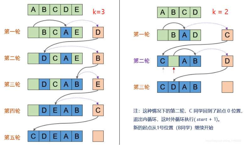环状替换主要考虑两种情况,一种是数组长度是奇数的情况,这种情况下,形成环的方式只有一种。另一种情况也就是长度是偶数的情况,会形成多个环的情况,具体可以参考:https://leetcode-cn.com/problems/rotate-array/solution/xuan-zhuan-shu-zu-yuan-di-huan-wei-xiang-xi-tu-jie/ 如下截图来自该链接。