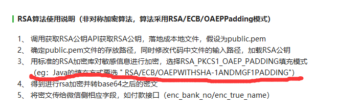 public static void main(String[] args) throws Exception{ String rsa ="RSA/ECB/OAEPWITHSHA-1ANDMGF1PADDING"; PublicKey pub=RSAUtil.getPubKey(Constant.WX_PUBLIC_KEY,"RSA"); byte[] estr=RSAUtil.encrypt("6222804263000108304".getBytes(),pub,2048, 11,rsa); String bankno = Base64Util.encode(estr); System.out.println(bankno); } }