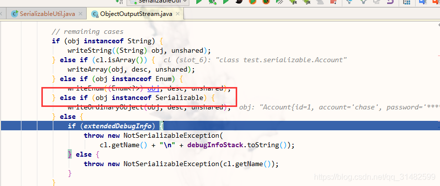 1 2 3 4 5 6 7 8 9 10 在实现Serializable 接口的情况下 Account{id=1, account='chase', password='********', email='wfp_chase@163.com'} Account{id=1, account='chase', password='null', email='wfp_chase@163.com'} 如果删除 Account中的 implements Serializable 运行结果则会抛异常 Exception in thread "main" java.io.NotSerializableException: test.serializable.Account at java.io.ObjectOutputStream.writeObject0(ObjectOutputStream.java:1184) at java.io.ObjectOutputStream.writeObject(ObjectOutputStream.java:348) at test.serializable.SerializableUtil.serialize(SerializableUtil.java:20) at test.serializable.SerializableUtil.main(SerializableUtil.java:44)