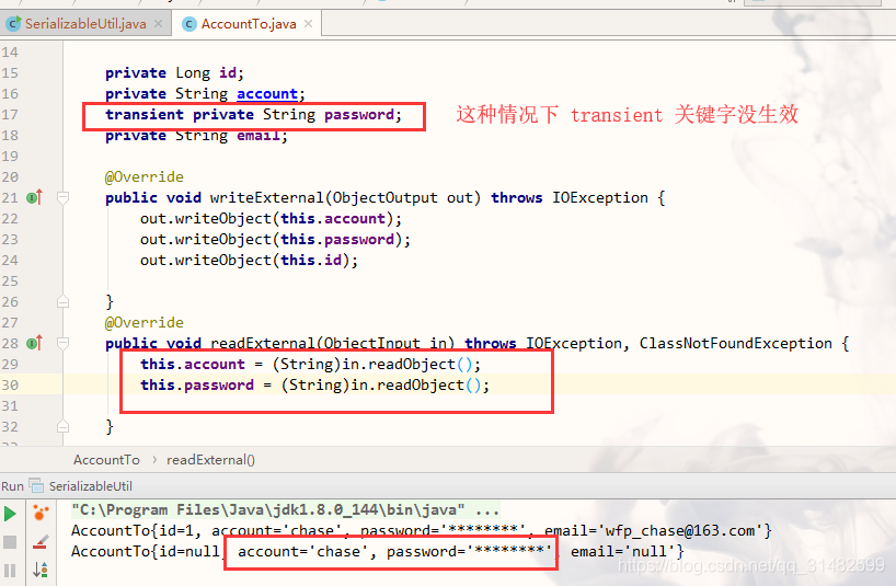 Java序列化之Externalizable 使用Externalizable时,需要实现如下两个方法,用于控制序列化和反序列化的类中属性字段,需要注意的是 transient 关键字将不会在这种情况下起作用。