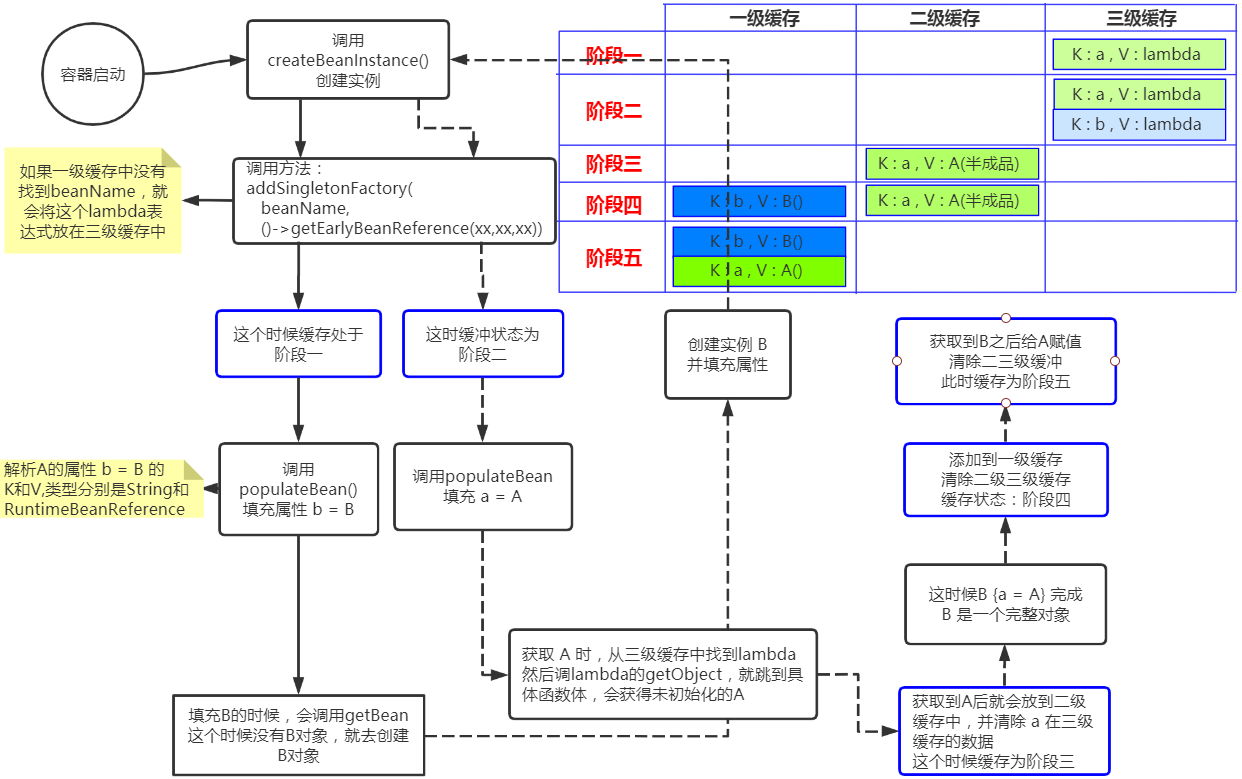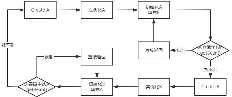 在Spring中,对象的创建 分为两个部分,一个是实例化,另一个是初始化,两个对象A、B互相引用,在对象初始化过程中会有如下的步骤: