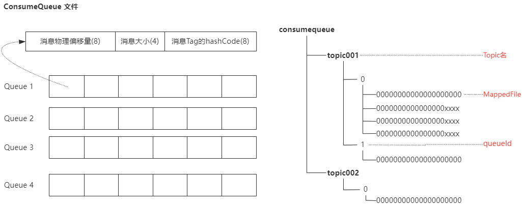 - consumequeue文件夹的组织方式如下:$HOME/store/consumequeue/{topic}/{queueId}/{fileName}