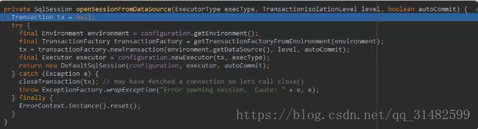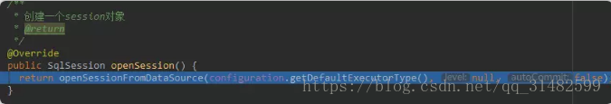 我们接下来要看看 SqlSession 的创建过程和运行过程,首先调用了 sqlSessionFactory.openSession() 方法。该方法默认实现类是 DefaultSqlSessionFactory ,我们看看该方法如何被重写的
