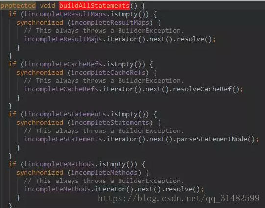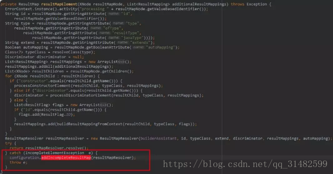 注意看注释(大意):解析缓存中所有未处理的语句节点。当所有的映射器都被添加时,建议调用这个方法,因为它提供了快速失败语句验证。意思是如果链表中任何一个不为空,则抛出异常,是一种快速失败的机制。那么这些是什么时候添加进链表的呢?答案是catch的时候,看代码: