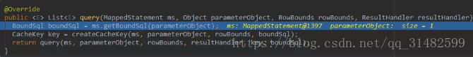 我们已经有了参数绑定对象,该对象中有SQL语句,参数。继续向下执行,从该对象获取参数映射集合,如果为空,则再次创建一个 BoundSql 对象。