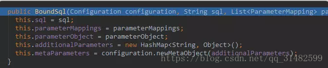 回到 BoundSql 的构造器,首先赋值SQL, 参数映射对象数组,参数对象,默认的额外参数,还有一个元数据参数。
