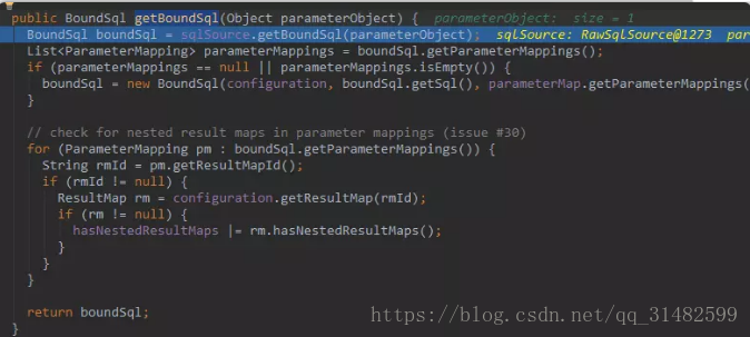 接着循环参数,先获取 resultMap id,如果有,则从配置对下中获取resultMap 对象,如果不为null,则修改 hasNestedResultMaps 为 true。最后返回 BoundSql 对象。