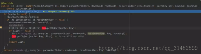 注意:mybatis 一级缓存默认为true,二级缓存默认false。创建缓存的过程很简单,就是将所有的参数的key或者id构造该 CacheKey 对象,使该对象唯一。最后执行query方法: