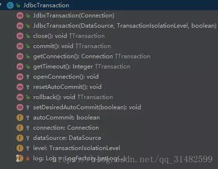 我们回到 openSessionFromDataSource 方法,获取了 JdbcTransactionFactory 后,调用 JdbcTransactionFactory 的 newTransaction 方法创建一个事务对象,参数是数据源,level 是null, 自动提交还是false。newTransaction 创建了一个 JdbcTransaction 对象,我们看看该类的构造: