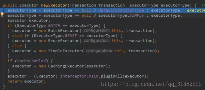 继续回到 openSessionFromDataSource 方,法此时已经创建好事务对象。接下来将事务对象执行器作为参数执行 configuration 的 newExecutor 方法来获取一个 执行器类。