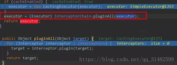 回到 newExecutor 方法,判断是否使用缓存,默认是true, 则将刚刚的执行器包装到新的 CachingExecutor 缓存执行器中。最后将执行器添加到所有的拦截器中(如果配置了话),我们这里没有配置。