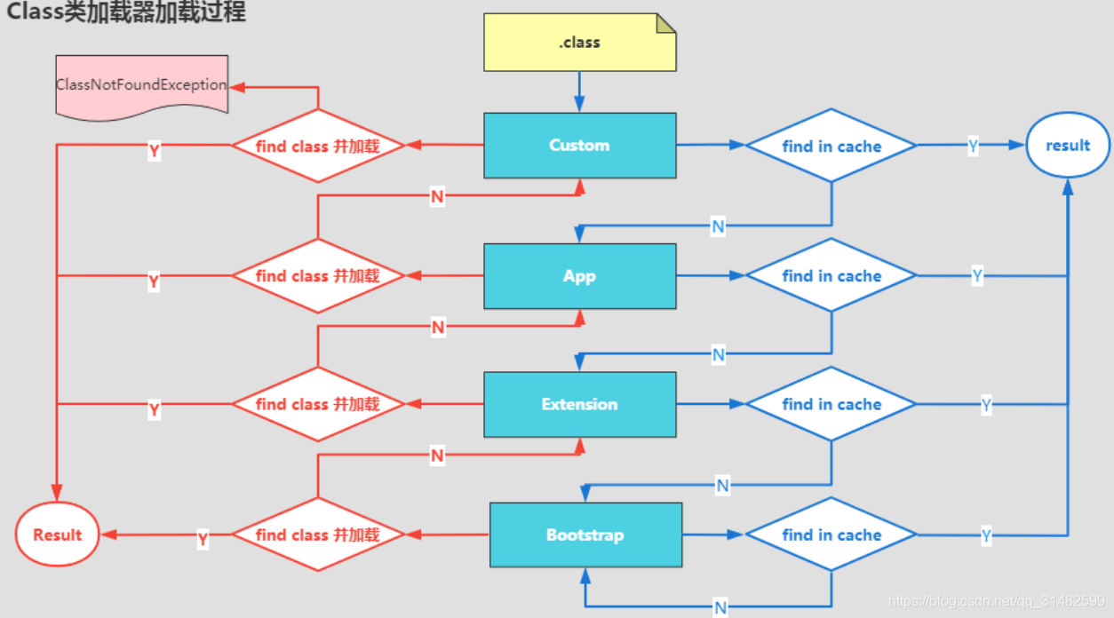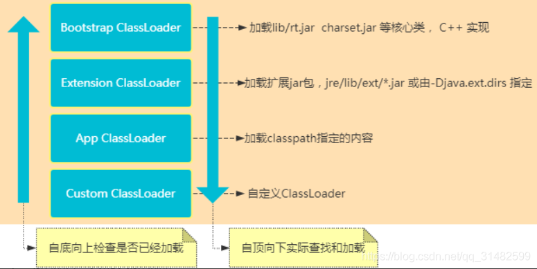 过程: class首先会从 Custom加载器(缓存 ——每个类加载器 维护一个list 用来管理已经加载的对象引用)中找,找到返回结果,找不到会从上层加载器APP中找,如果还是找不到再到Ext加载器中招,一直到Bootstrap加载器,(前面的find 都是从缓存中找),如果缓存中没有,则find class 并加载,如果 bootstrap没有加载到,则交给下一层加载器 ext find class 并加载 ,直到custom 。如果custom 没有找到class,则报错 ClassNotFoundException异常