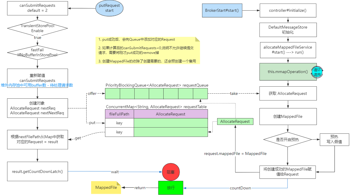 putRequestAndReturnMappedFile(提交创建映射文件请求) 如下为整个AllocateRequestService创建MappedFile的请求流程