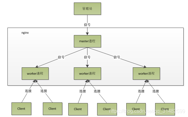 nginx是通过信号来控制,比如关闭,重启等去控制nginx进程。nginx信号是属于nginx进程间的通信的一种机制,比如master主进程控制多个worker子进程,也是通过信号控制的,如下图。