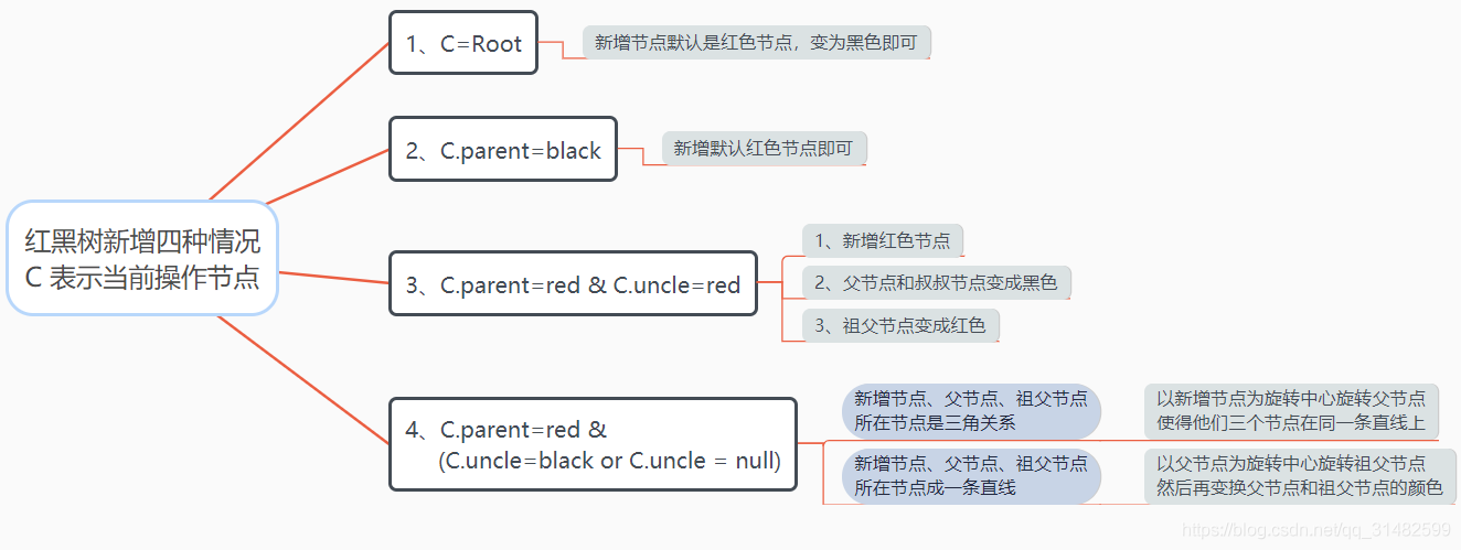 - d、当前操作节点为变成红色的祖父节点(递归他坐在的父节点是否满足红黑树原则)